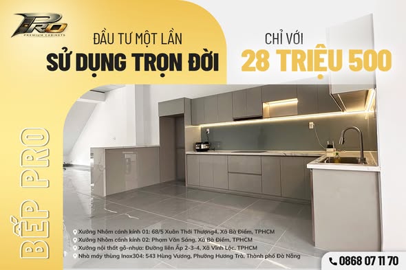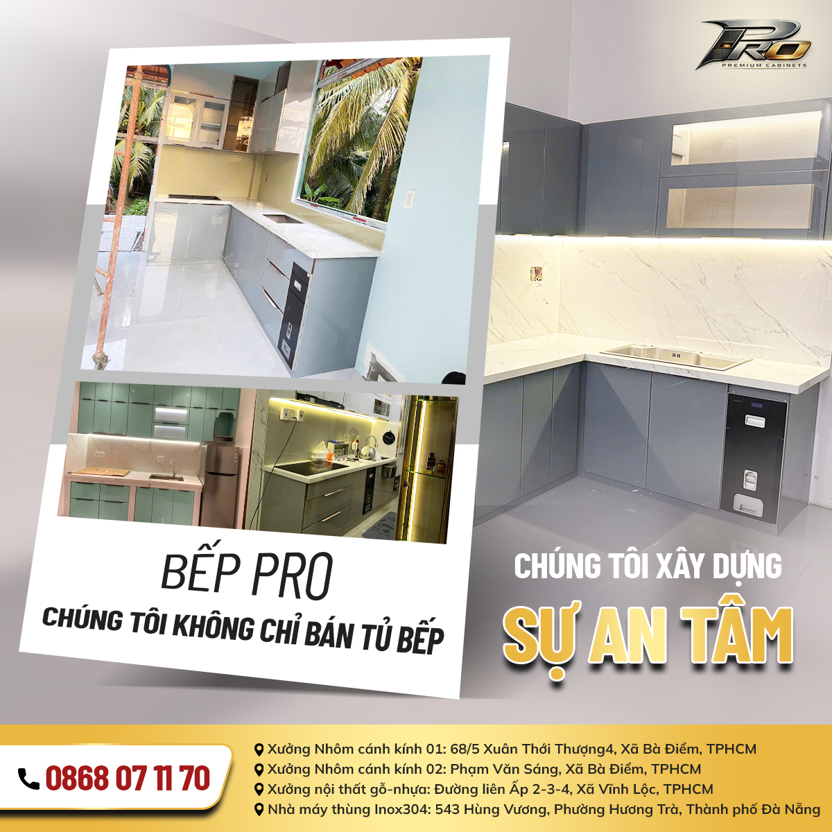 Công ty Cổ phần Nội thất Bếp Pro tự hào là chuyên gia hàng đầu trong lĩnh vực thiết kế và thi công hệ tủ bếp Nhôm & Inox cánh kính cao cấp tại Việt Nam. Bằng việc làm chủ công nghệ vật liệu mới, Bếp Pro mang đến giải pháp đột phá giúp loại bỏ hoàn toàn nỗi lo mối mọt, cong vênh và kháng nước tuyệt đối 100%. Chúng tôi cam kết kiến tạo không gian bếp hiện đại, thẩm mỹ đẳng cấp Âu – Mỹ với độ bền vĩnh cửu, đồng hành cùng giá trị sống vững bền của mỗi gia đình Việt.